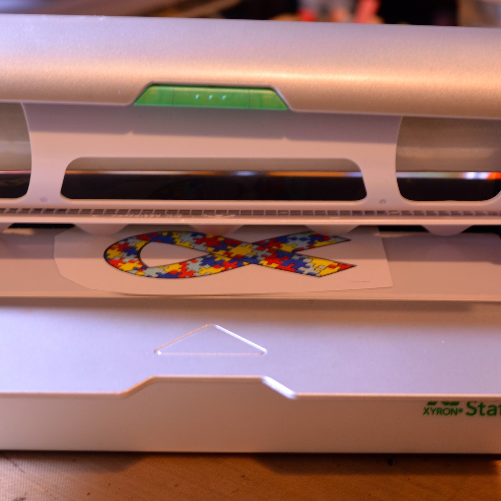 Now on to the tutorial- for today's project I decided to use the Autism Awareness Ribbon stamp to make both a card and a magnet using my Xyron Creative Station.
