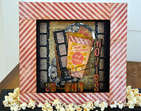 I used one of my favorite stamp sets At the Movies CMS081 for the popcorn box and also the Ticket Collage wood mounted stamp for the background. I added 2 cut-out from the Picture Wheel Bigz die which I cut out of foil card stock, painted with Distress paint and place atop frosted film to give the look of a true negative reel,